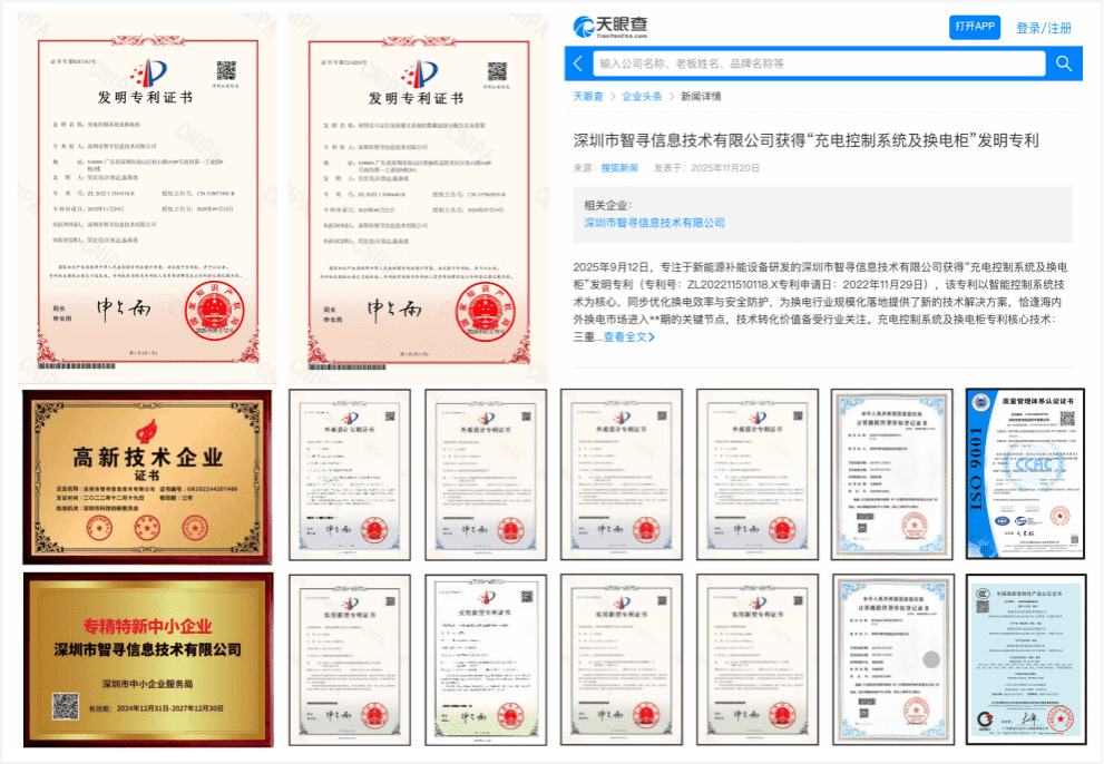 公司拥有自主知识产权的核心专利70多项,包括已获的4项注册商标、2项发明专利、11项实用新型专利、7项外观专利、22软件著作权(含电动车充换电运营系统系列),审核中的发明专利3项、使用新型5项、软著25项,以及拥有第二类增值电芯业务资质,荣获3C认证、ISO9001等多项质量管理体系认证。其中,2025年公司获得的“充电控制系统及换电柜”发明专利(专利号:ZL202211510118.X专利申请日:2022年11月29日)已获得批量化应用;LinkOne管理系统、 电动车充电断电保护系统、 电动自行车智能充换电运营系统、 锂电池充电安全保护系统、 充换电柜故障运维AI交互系统、 充换电快充服务管理系统、BMSONE锂电池管理系统、锂电池租赁远程控制管理系统、电动自行车智能充电系统、动力锂电池自动检测及精确定位控制系统、电动车锂离子电池均衡系统、锂电池北斗定位BMS数据管理系统等已在市场上规模化使用;深圳市 取得一种电池柜组件及换电柜设备专利,提高了电池柜组件的散热效果。